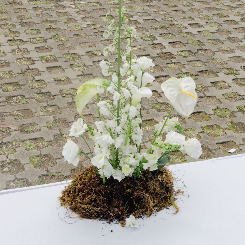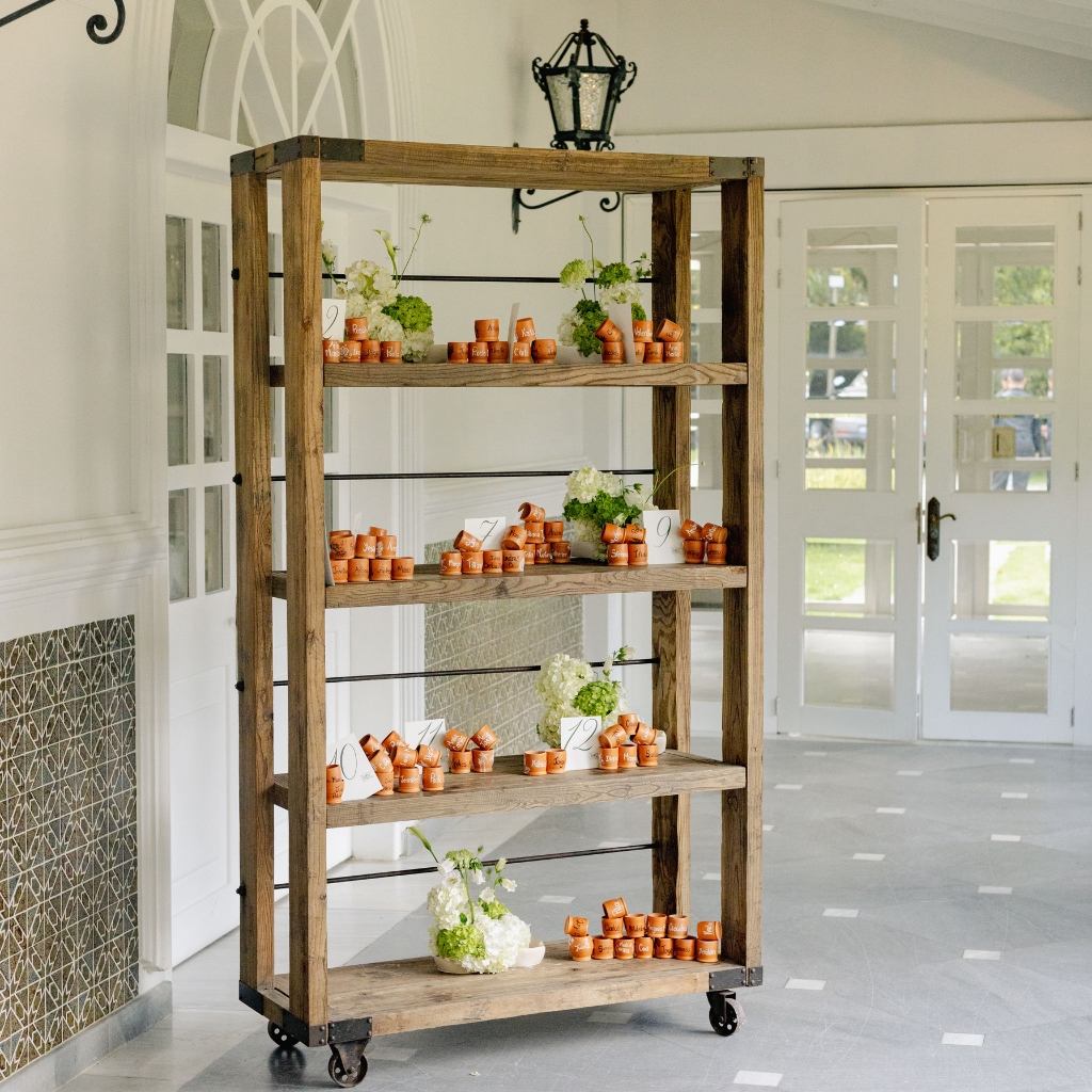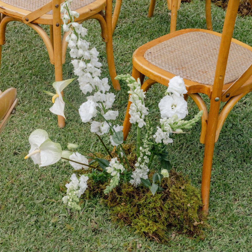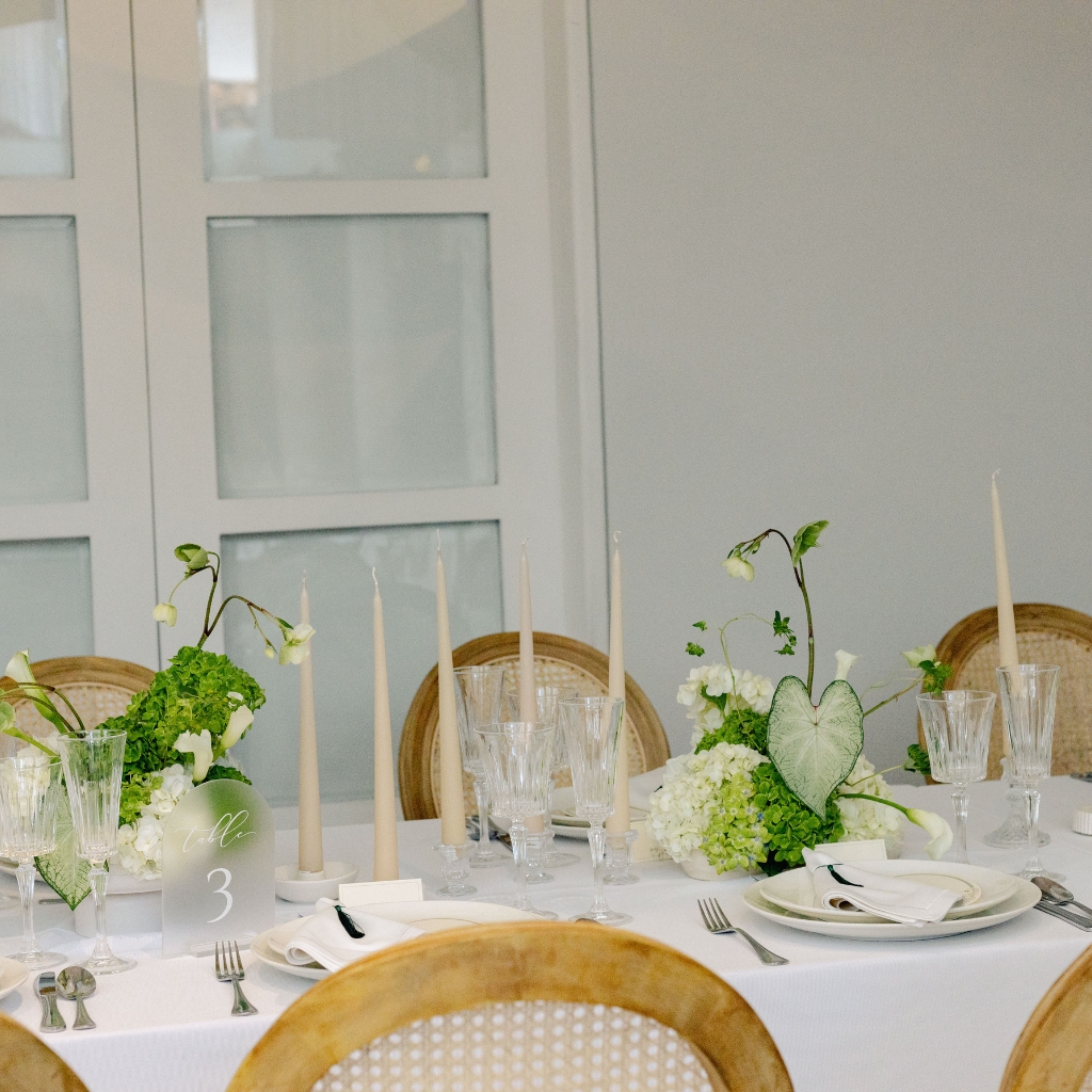 En la composición floral se trabajaron diseños orgánicos de baja altura, permitiendo que la conversación fluya libremente. Las flores blancas combinadas con acentos verdes crean contraste sutil, aportando frescura y sofisticación. Las velas cónicas en tonos neutros refuerzan la verticalidad del montaje y añaden una iluminación cálida y elegante al caer la tarde.