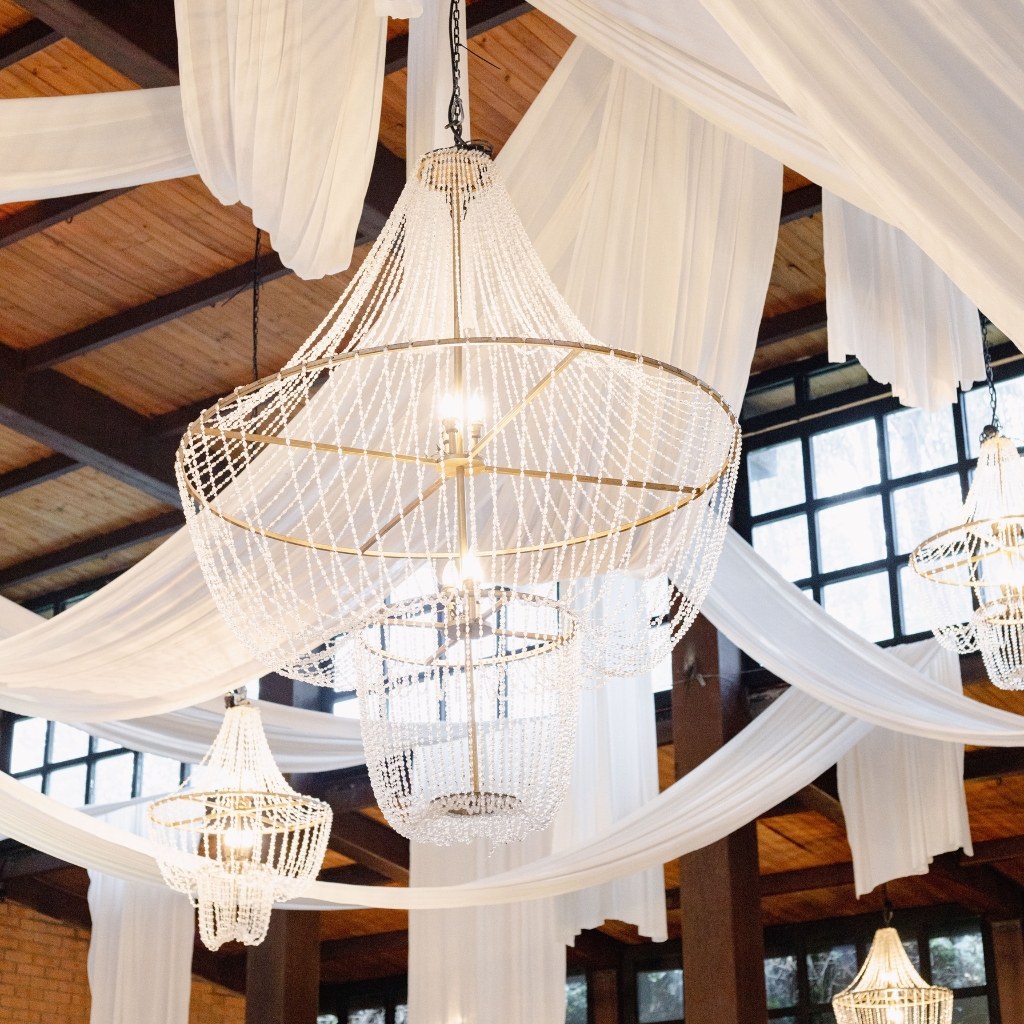 El espacio se transforma a través de una instalación aérea de gran formato. Candelabros contemporáneos, intervenidos con cristal y estructura dorada, flotan entre velos de tela suspendidos. La luz no solo ilumina: envuelve, dramatiza y eleva la atmósfera.