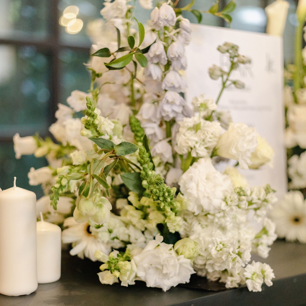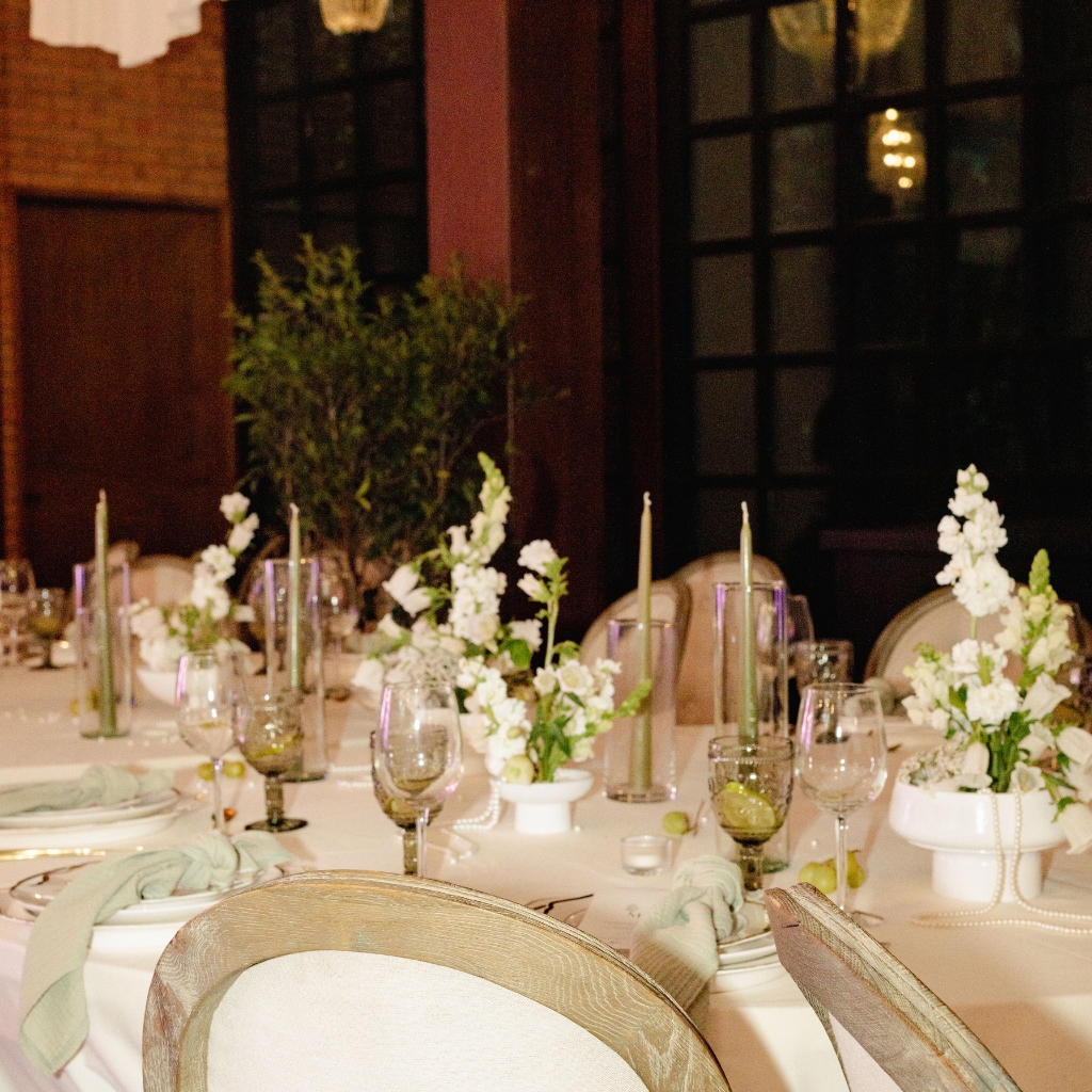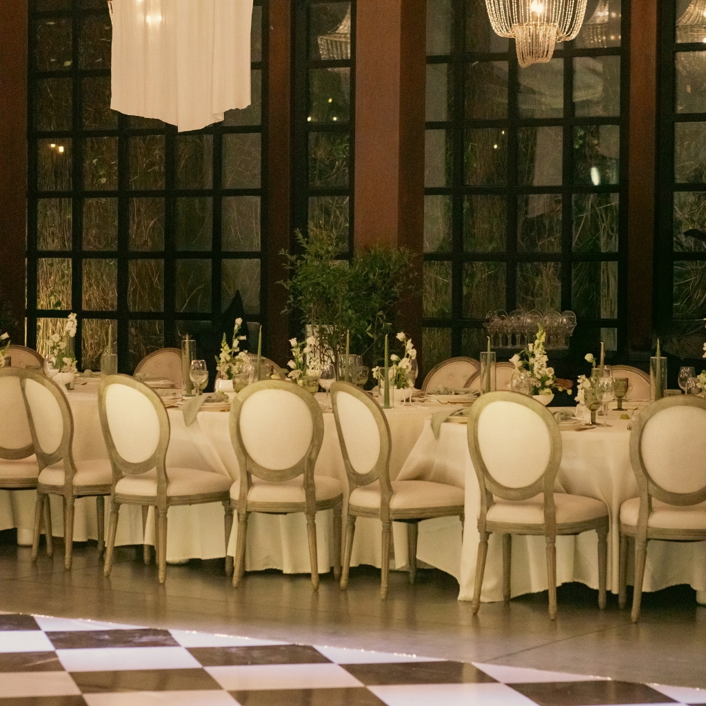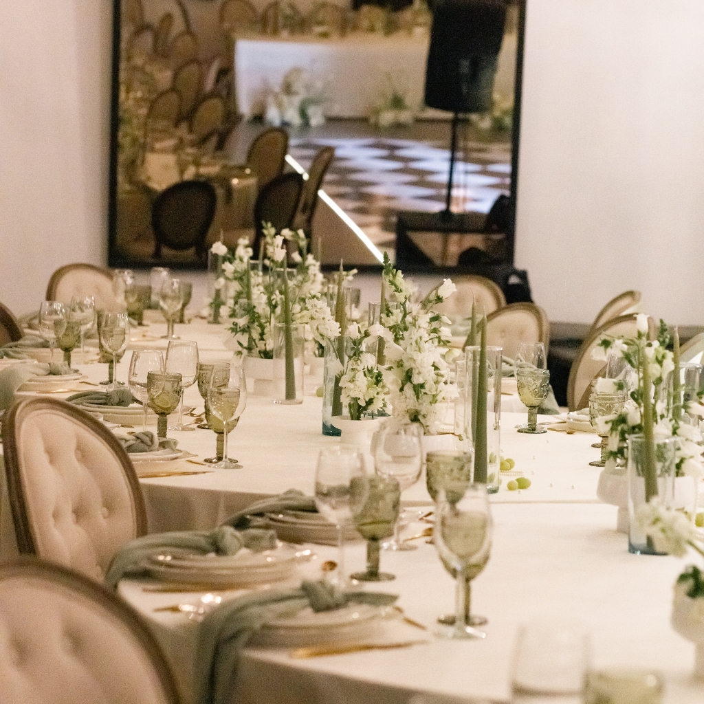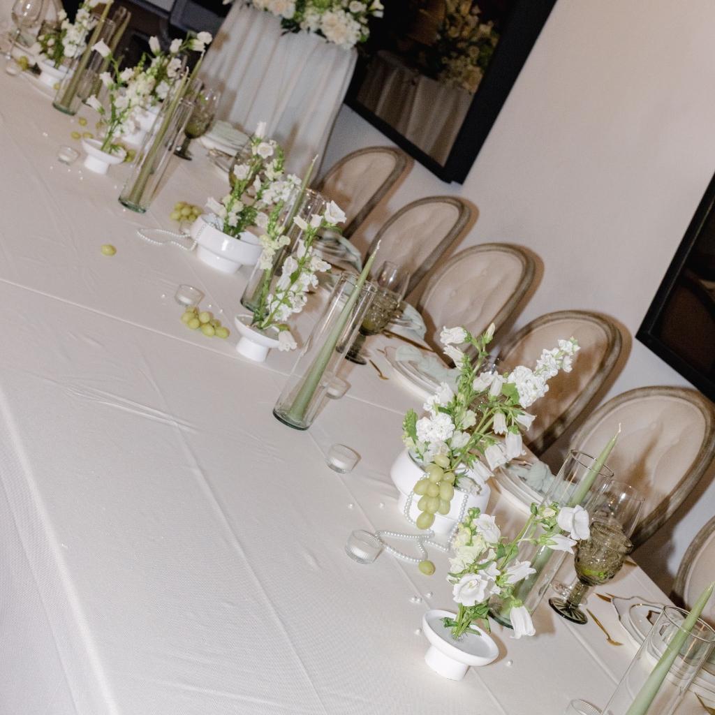 La paleta se mantiene en una línea neutra y sofisticada. Blancos suaves, marfil y verdes naturales dialogan con materiales nobles y texturas translúcidas. La mesa se construye desde la sutileza: centros bajos con flores blancas orgánicas, velas estilizadas en cilindros de vidrio y pequeños detalles que aportan ritmo visual sin recargar.